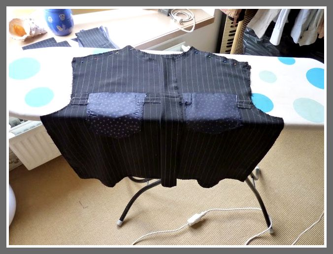 The front of the jacket has an upper and a lower part. Two front pockets have been adjusted on the seam between upper and lower part. The pockets have been made from the fabric that will also be used for the lining, a beautifil dark blue soft shining fabric, with small round motifs.
