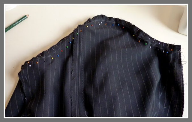 The picture shows a mass of pins, meant to fix the sleeve into the jacket. That is my way of setting sleeves.