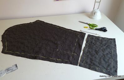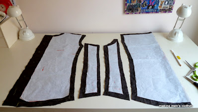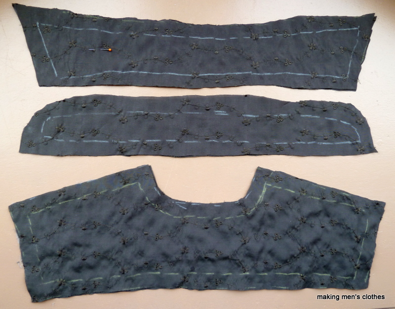 From left to right: the front part with an extra allowance for the placket, two parts which together form the side of the shirt and the back part which borders the fold of the folded fabric. I arranged these parts in such a way that the design of the embroidery would be vertical in the finished shirt.