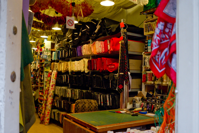 There is a wide variety of woven fabrics, piled up to the ceilings, a large collection of faux leather and latex, and all kinds of buttons, zippers, ribbons and ruffles.