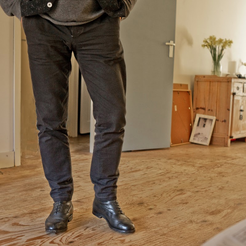 The result was rather satisfactory. Slender cut black velvet denim pants. Slit pockets in the side seams, welt pockets on the back.